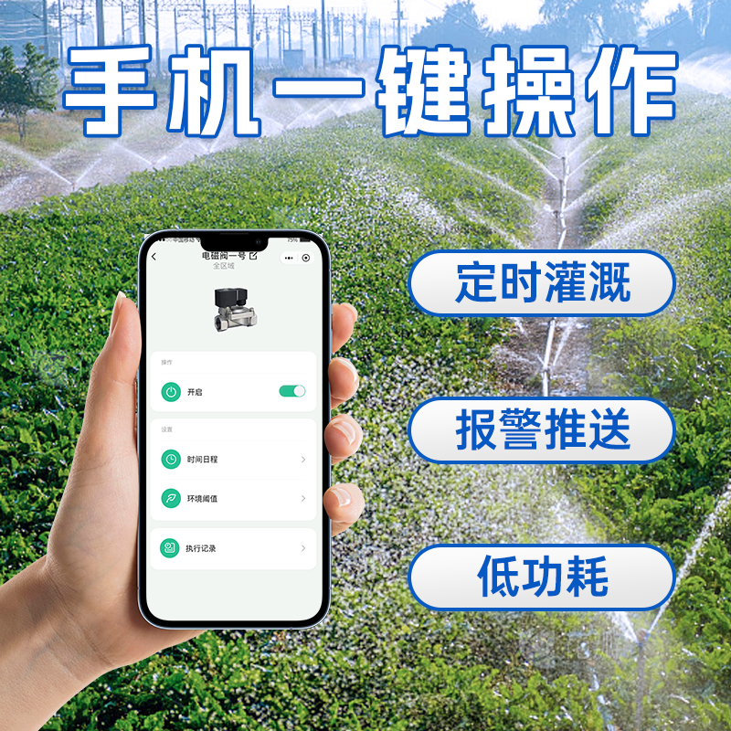 智能閥控器采用高性能、低功耗處理芯片和4G/5G通信模塊,使用太陽能供電,解決灌溉場景下供電安全問題。遠(yuǎn)程通過APP監(jiān)測電磁閥開啟狀態(tài)及控制電磁閥開啟或關(guān)閉,支持自定義定時自動化配置,同時可接入不同傳感器實(shí)現(xiàn)環(huán)控自動化灌溉需求。